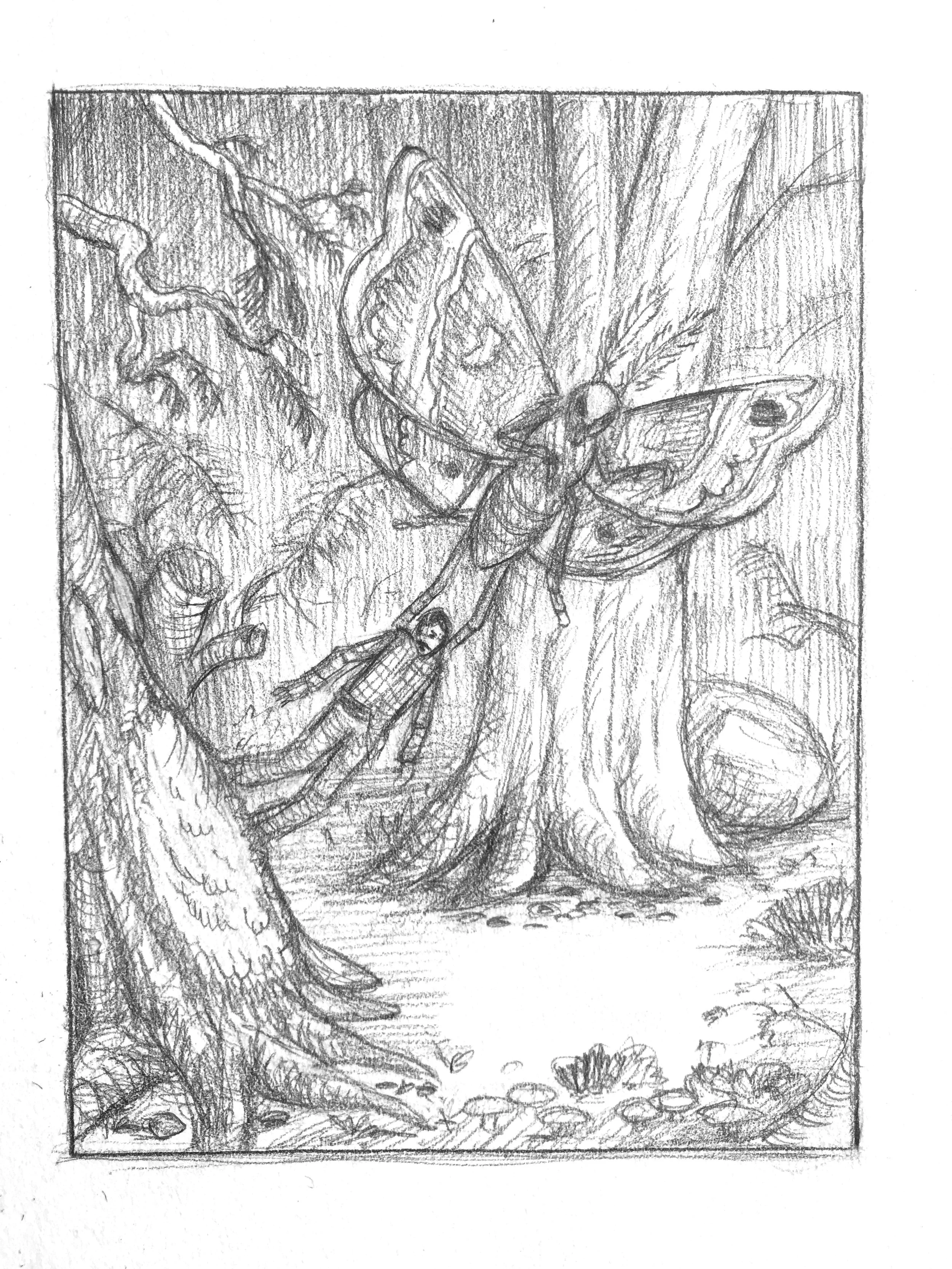 At some point, Rudolph lost consciousness, for he awoke to find himself in the shelter of a cave, bathed in the warm glow of a fire. Next to where he lay was a bowl of what appeared to be fresh meat. Mad with hunger, Rudolph began devouring the meal before realizing he wasn’t alone. Something was sitting on the other side of the fire. As his eyes adjusted to the gloom, he saw a moth of tremendous size, a specimen larger than any known bird, larger than a person, something prehistoric. Most would be horrified, but Rudolph was not afraid, for he revered moths. The Moth began to speak to him in an alien language of clicking and buzzing sounds, and somehow, Rudolph understood the creature perfectly.